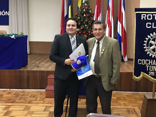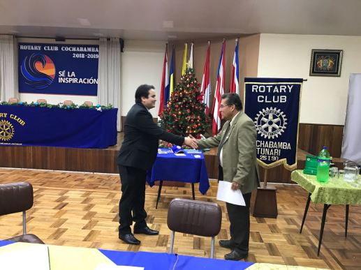 El nuevo socio del Rotary Tunari recibiendo el saludo de nuestro Presidente Jorge Loayza
